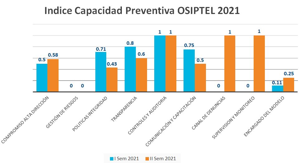 De acuerdo al Reporte de Integridad 2021 elaborado por la Secretaría de Integridad Pública de la Presidencia del Consejo de Ministros, el OSIPTEL obtuvo una calificación del ICP a diciembre de 2021 del 55%.