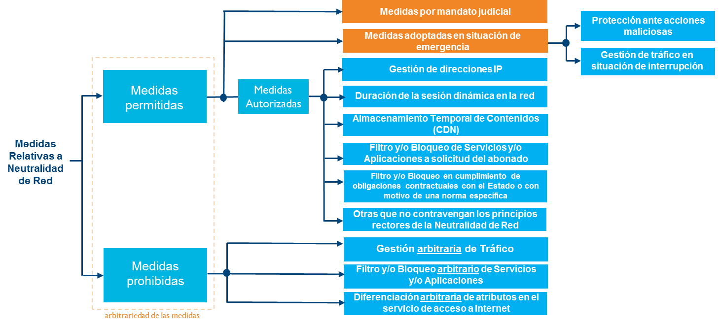 El esquema general del Reglamento de Neutralidad de Red especifica 11 tipos de medidas, clasificadas entre permitidas y prohibidas: