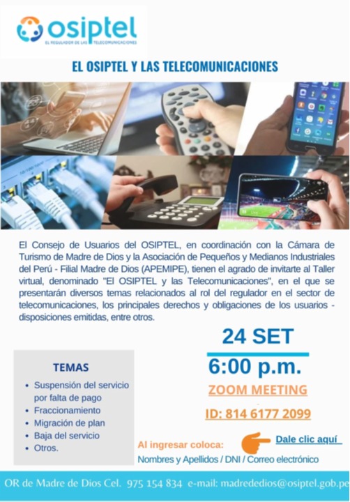 El Consejo de Usuarios del OSIPTEL, en coordinación con la Cámara de Turismo de Madre de Dios y la Asociación de Pequeños y Medianos Industriales del Perú - Filial Madre de Dios (APEMIPE), tienen el agrado de invitarte al Taler virtual, denominado "EI OSIPTEL y las Telecomunicaciones, en el que se presentarán diversos temas relacionados al rol del regulador en el sector de telecomunicaciones, los principales derechos y obligaciones de los usuarios - disposiciones emitidas, entre otros.