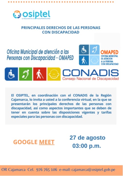 El OSIPTEL, en coordinación con el CONADIS de la Region Cajamarca, lo invita a usted a la conferencia virtual, en la que se presentarán los principales derechos de las personas con discapacidad, así como aspectos importantes que se deben de tener en cuenta sobre las disposiciones vigentes y tarifas especiales para las personas con discapacidad.