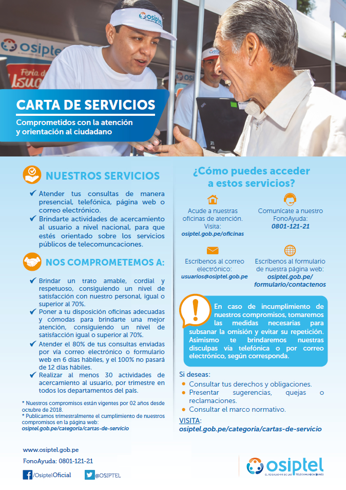 Las Cartas de Servicio son documentos legales que contienen diversos objetivos de mejora continua dispuestos por el OSIPTEL, en beneficio de la ciudadanía, buscando mejorar la calidad de nuestros servicios y fortalecer la satisfacción del usuario.