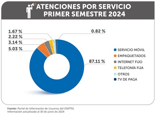Si se analiza solo las atenciones realizadas a solicitud de los usuarios, el 87.11 % (253 595) trató sobre el servicio móvil, es decir, 8 de cada 10 atenciones. Con una menor cantidad se brindaron atenciones sobre empaquetados (14 649), internet fijo (9152), telefonía fija (6462), televisión de paga (2396) y otros (4869), como se puede verificar en el Portal de Información de Usuarios del OSIPTEL.
