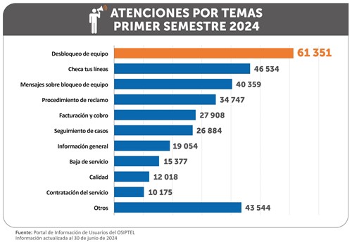 Con respecto a los temas, la mayor cantidad de atenciones fue sobre problemas y consultas de usuarios referentes al desbloqueo de equipo (61 351) en el marco de la implementación de la tercera fase del Registro Nacional de Equipos Terminales Móviles para la seguridad (Renteseg). Le siguieron los relacionados a Checa tus líneas (46 534), mensajes sobre bloqueo de equipo (40 359), procedimiento de reclamo (34 747), facturación y cobro (27 908), seguimiento de casos (26 884), entre otros.