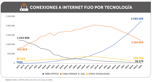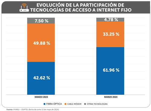 A marzo de 2024, las conexiones de fibra óptica representan el 61.96 % del total conexiones de internet fijo, 19.34 puntos porcentuales más que el mismo periodo del año anterior. En tanto, existe un decreciente uso del cable módem, conocido como HFC (Hybrid Fiber Coaxial, por sus siglas en inglés), el cual, tras perder 16.63 puntos porcentuales, representa el 33.25 % de conexiones.