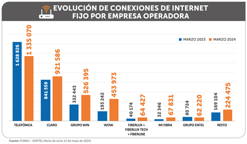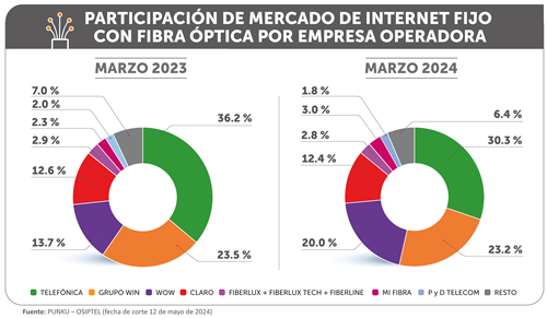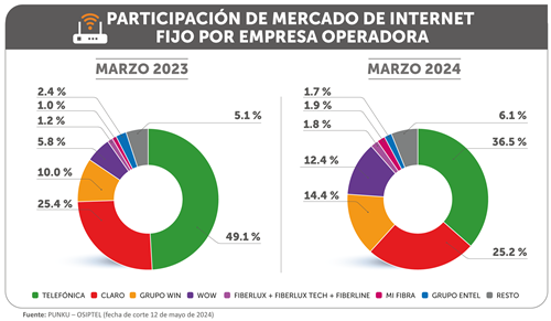 Esto motivó que Telefónica del Perú perdiera más de 12 puntos porcentuales de su participación de mercado con respecto al cierre del primer trimestre de 2023. Pero, pese a ello, continuó liderando este mercado con una participación del 36.5 %, seguida por Claro (25.2 %). En este escenario, la empresa Wow (+6.6 puntos porcentuales) y el grupo Win (+4.4 puntos porcentuales) fueron las que avanzaron en el market share de internet fijo y cerraron el mes de marzo de 2024 con 12.4 % y 14.4 % de participación, respectivamente.