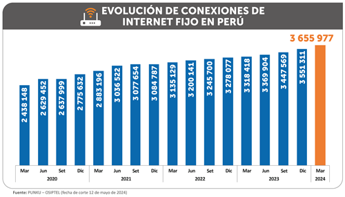Las mejoras tecnológicas que permiten acceder a velocidades superiores de internet fijo impulsan la creciente demanda por conectividad en el país y una mayor dinámica competitiva en el mercado. Así, al cierre del primer trimestre de 2024, las empresas operadoras reportaron 3.66 millones de conexiones de este servicio, superando en 10.17 % a lo registrado en el mismo periodo del año anterior, informó el Organismo Supervisor de Inversión Privada en Telecomunicaciones (OSIPTEL).