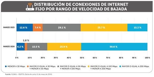 El cambio tecnológico en las conexiones a internet fijo, posibilitan que los usuarios puedan acceder a mayores velocidades de descarga en este servicio. A marzo de 2024, las conexiones con rango de velocidad de bajada igual o mayor a 200 Mbps (megabits por segundo), representan el 50.6 % del total del mercado.