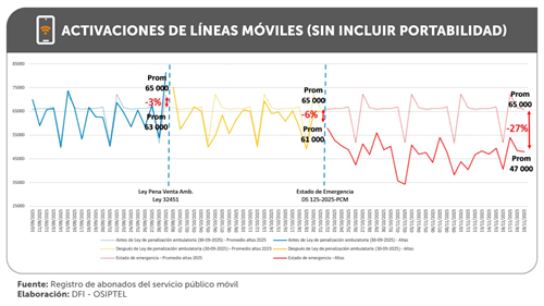 Agregó que, la declaratoria del estado de emergencia, el 21 de octubre, el efecto de la Ley n° 32451, el trabajo regulatorio y de fiscalización, así como el despliegue multisectorial de acciones en materia de seguridad ciudadana, han impactado estadísticamente de manera importante en las nuevas activaciones de líneas móviles.