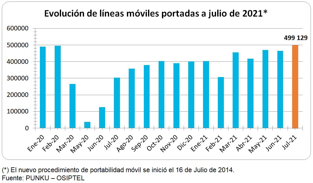 Un total de 499 129 líneas móviles cambiaron de empresa operadora en julio, la cifra mensual más alta registrada en lo que va del año y que evidencia la paulatina consolidación del dinamismo en las portaciones, con resultados similares a los observados hace 18 meses, es decir, antes de la pandemia, informó el Organismo Supervisor de Inversión Privada en Telecomunicaciones (OSIPTEL).