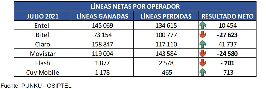 Un total de 2882 líneas fijas cambiaron de empresa operadora en julio, mes en el que Claro, Optical Networks y Fravatel lograron los mayores resultados positivos con 1 876, 226 y 188 líneas netas fijas ganadas, respectivamente; mientras que Telefónica, Americatel y Lumen (antes Century Link) obtuvieron un saldo negativo de 2 276, 103 y 15 líneas, respectivamente.
