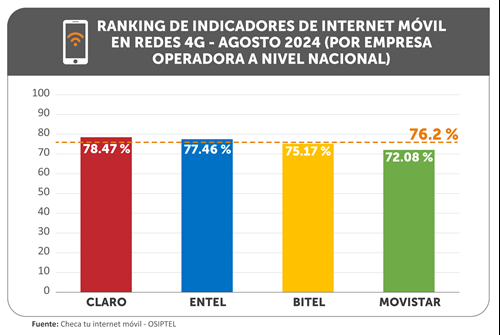 Con esta nueva funcionalidad, se determinó que, en agosto, el promedio ponderado del ranking de indicadores a nivel nacional, el cual está compuesto por los indicadores de velocidad de subida y bajada, latencia, pérdida de paquetes y tiempo de cobertura, fue de 76.2 %, para redes 4G, calificación considerada como adecuada.