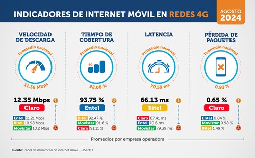 En el desagregado por indicadores, Claro tuvo el mejor desempeño en velocidad promedio de descarga en redes móviles 4G con 12.35 Mbps (megabits por segundo).