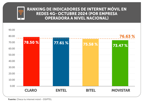 En octubre de 2024 se registró una leve mejora en el servicio de internet móvil para redes 4G, en base al análisis de la experiencia del usuario realizada por el Organismo Supervisor de Inversión Privada en Telecomunicaciones (OSIPTEL). El promedio ponderado de los indicadores de internet móvil fue de 76.63 % a nivel nacional, 0.37 puntos porcentuales más respecto al obtenido en setiembre (76.26 %).