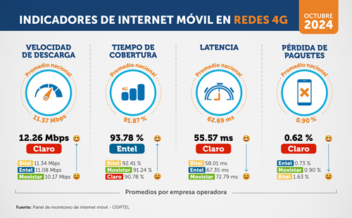 Claro tuvo el mejor desempeño en velocidad promedio de descarga en redes móviles 4G con 12.26 Mbps (megabits por segundo), por encima de Bitel (11.34 Mbps), Entel (11.08 Mbps). Más atrás se ubicó Movistar (10.17 Mbps).