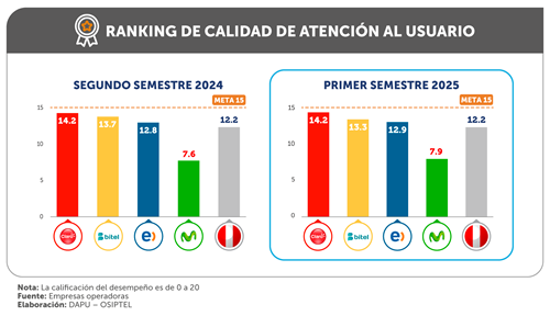El Ranking de Calidad de Atención al Usuario, elaborado por el Organismo Supervisor de Inversión Privada en Telecomunicaciones (OSIPTEL), reveló que, al primer semestre de 2025, las empresas operadoras permanecen con baja calificación en la rapidez para atender a usuarios o capacidad de respuesta, reduciéndose así la calificación nacional de 9.4 puntos obtenidos en el periodo anterior a 9 puntos, muy por debajo de la nota mínima esperada de 15.