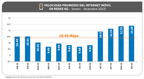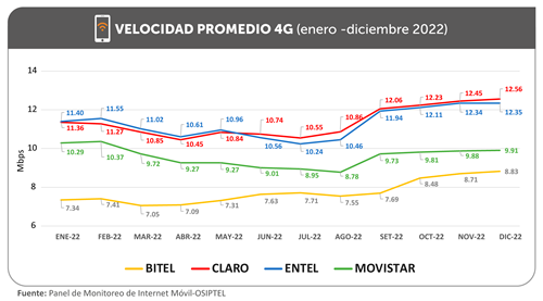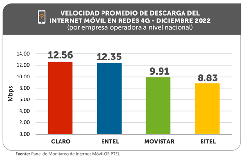 En 2022, la velocidad promedio de descarga para redes móviles 4G a nivel nacional, considerando un promedio ponderado por los eventos medidos, fue de 10.45 Mbps (megabits por segundo), siendo Claro, con 11.43 Mbps, y Entel, con 11.38 Mbps, las empresas operadoras con mejor desempeño, seguidos por Movistar (9.64 Mbps) y Bitel (7.74 Mbps), informó el Organismo Supervisor de Inversión Privada en Telecomunicaciones (OSIPTEL).