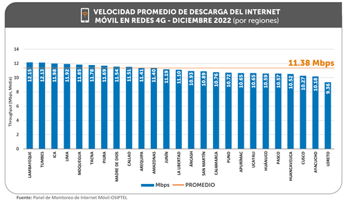 En diciembre, la velocidad móvil promedio se elevó en 17 regiones del país, pero solo once obtuvieron resultados por encima del promedio nacional: Lambayeque (12.14 Mbps), Tumbes (12.13 Mbps), Ica (11.98 Mbps), Lima (11.92 Mbps), Moquegua (11.85 Mbps), Tacna (11.78 Mbps), Piura (11.69 Mbps), Madre de Dios (11.54 Mbps), Callao (11.51 Mbps), Arequipa (11.41 Mbps) y Amazonas (11.40 Mbps).