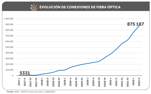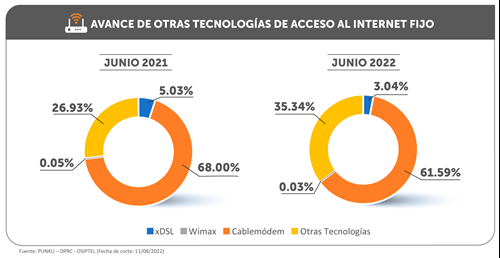 De otro lado, se confirma el crecimiento sostenido del acceso a internet a través de otras tecnologías, que sumó 1 120 845 conexiones a junio de 2022, lo que representó un crecimiento de 38.1 % respectó al mismo mes de 2021.
