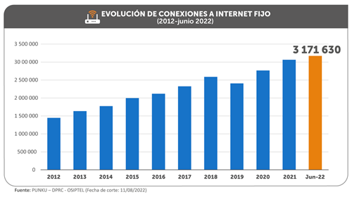 En los últimos diez años, las conexiones al servicio de internet fijo más que se duplicaron. Al cierre de junio de este año, las conexiones a este servicio registraron un incremento de 135.5 %, con relación a junio del 2012 (1 346 535 conexiones).