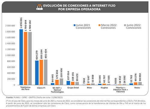 Un total de 67 empresas operadoras reportaron información sobre servicios de conexión a internet fijo en todo el país al cierre de junio de este año. De acuerdo con la información procesada por la Dirección de Políticas Regulatorias y Competencia del OSIPTEL, Telefónica del Perú y el Grupo Entel son las que más redujeron su participación en los últimos doce meses, lo cual ha sido aprovechado por el grupo conformado por Wi-net y Optical Technologies, por la empresa Wow y por el grupo conformado por las empresas Fiberlux, Fiberlux Tech y Fiberline, los cuales han incrementado su participación en 4.8, 1.4 y 0.5 puntos porcentuales, respectivamente.