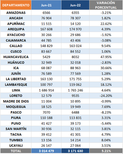 Diecisiete departamentos incrementaron las conexiones al servicio de internet fijo a junio de 2022. Huancavelica (+47.95 %), Ica (+30.66 %), Apurímac (+22.62 %) y Lambayeque (+18.12 %) fueron los departamentos que mayor variación porcentual en la cantidad de conexiones presentaron, a diferencia de Loreto (-24.20 %), Pasco (-8.23 %), Puno (-5.44 %) y Amazonas (-3.21 %), que fueron las que más retrocedieron en la cantidad de conexiones con relación al mismo periodo del año anterior.