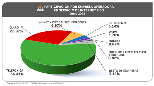 Pese a ello, Telefónica del Perú continuó liderando este mercado con una participación del 56.41 %, seguida por Claro (26.97 %). En tanto, el grupo de empresas Wi-NET y Optical Technologies se ubicó en el tercer lugar con 6.97 %. Con ello, desplazó al cuarto lugar al grupo Entel (3.14 %). Le siguen Wow (1.70 %), Hughes (0.87 %) y el grupo conformado por las empresas Fiberlux, Fiberlux Tech y Fiberline (0.82 %).