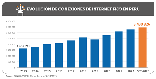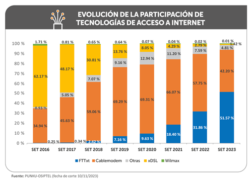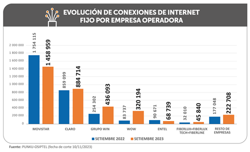 Al cierre del mes de setiembre de 2023, el acceso a internet fijo superó las 3.4 millones de conexiones. Participación de mercado del grupo Win y de Wow, avanza y suman