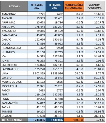 Sin considerar a Lima y Callao, las regiones están ganando mayor acceso al servicio de internet fijo en el país de forma progresiva. A fines de setiembre de 2023, agruparon el 42.2 % del total de conexiones, equivalentes a casi 1.45 millones de accesos. Esto significó una mayor concentración de 2.8 puntos porcentuales (166 661 conexiones) más que a fines de setiembre del año pasado.