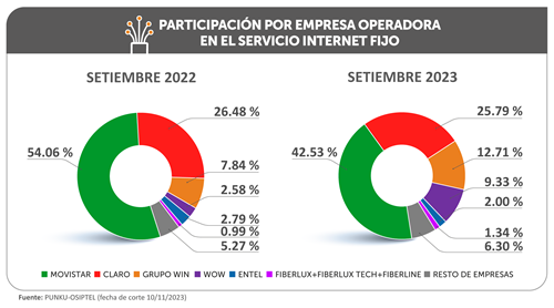 De acuerdo con la información procesada por la Dirección de Políticas Regulatorias y Competencia (DPRC) del OSIPTEL, a nivel de participación de mercado, el grupo Win registró una participación de 12.71 % a setiembre de 2023, mientras que Wow, el 9.33 %; es decir, ambas ya representan el 22.04 % del mercado de internet fijo, a diferencia del 10.42 % que representaban al cierre setiembre de 2022.