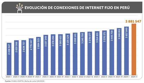 Este avance de la fibra óptica sigue impulsando el crecimiento de las conexiones del servicio de internet fijo a nivel nacional. A junio de 2024, se alcanzó los 3.88 millones de conexiones de internet fijo, lo que representó un avance de 15.17 % (+511 176 conexiones) respecto al mismo periodo del año previo, lo que reafirma la importancia de este servicio para el trabajo, los estudios, el entretenimiento, las oportunidades de negocios, entre otros, de millones de peruanos.