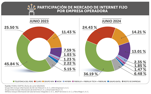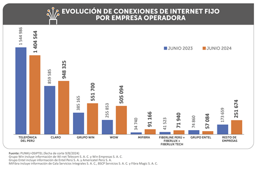 Al cierre del primer semestre de 2024, Telefónica del Perú continúa perdiendo conexiones de internet fijo y en el último año estas se redujeron en 140 422 (lo que representó un retroceso de 9.09 % en comparación del primer semestre de 2023), lo que ha sido aprovechado principalmente por Wow cuyas conexiones se incrementaron en 249 241 (+97.42 %) y el Grupo Win, en 166 535 (+43.24 %), que consolidaron su presencia en el mercado de internet fijo en el país. Cabe destacar el avance de 162.42 % del número de conexiones de MiFibra (Cala Servicios Integrales S. A. C., BSCP Servicios S. A. C. y Fibra Magic S. A. C.).