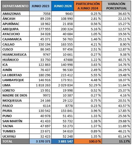 En lo que respecta a las cifras a nivel geográfico, al primer semestre de 2024, las conexiones en Lima y Callao se incrementaron en 11.43 % con respecto a similar periodo de 2023; mientras tanto, las otras regiones, en conjunto, tuvieron un avance de 20.42 %. Estas regiones concentran el 43.49 % del mercado nacional con 1.69 millones de conexiones.