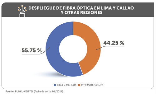 El mayor número de conexiones con fibra óptica se encuentra en Lima y Callao (1 416 169), que representa el 55.75 % del total de conexiones con esta tecnología a nivel nacional. En tanto, el 44.25 % de conexiones está al interior del país, destacando el despliegue en las regiones La Libertad (123 787), Lambayeque (121 902), Ica (121 854) y Piura (110 685).