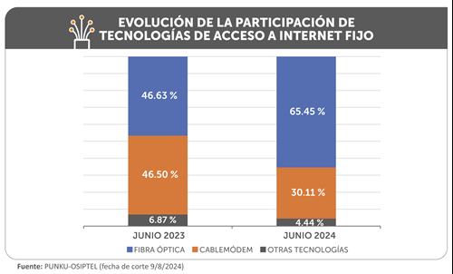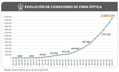 La penetración de la fibra óptica en el mercado de internet fijo sigue creciendo sostenidamente, impulsada por la demanda de mayores velocidades de acceso en este servicio, el cambio tecnológico en la oferta de servicio de las empresas operadoras con más años en el mercado y el ingreso de nuevos operadores que han incursionado haciendo uso de dicha tecnología. Al cierre del primer semestre de 2024, el Perú registró 2 540 374 conexiones de internet fijo con fibra óptica, un incremento de 61.66 % respecto a similar periodo de 2023, informó el Organismo Supervisor de Inversión Privada en Telecomunicaciones (OSIPTEL).