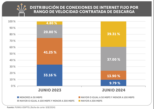 El crecimiento sostenido del número de conexiones de internet fijo con fibra óptica ha hecho que los usuarios tengan acceso a mayores velocidades de navegación. Así, el porcentaje de conexiones que cuenta con velocidades de bajada o descarga por encima de los 200 Mbps (megabits por segundo) creció más de ocho veces, al pasar de 161 672 conexiones en junio de 2023 a 1 525 903 conexiones al cierre de junio de 2024, de acuerdo a la información reportada por las empresas operadoras al Organismo de Supervisión de Inversión Privada en Telecomunicaciones (OSIPTEL).