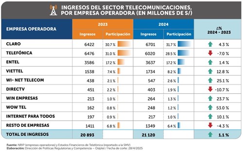 El sector telecomunicaciones en Perú registró ingresos por S/ 21 120 millones al cierre del 2024, lo que representa un incremento de 1.1 % respecto al año previo, informó el Organismo Supervisor de Inversión Privada en Telecomunicaciones (OSIPTEL).