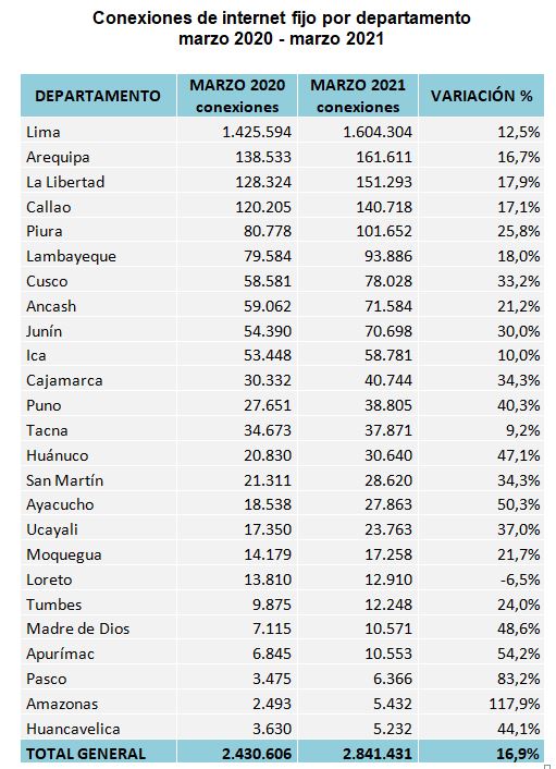 Del total de conexiones a internet fijo, el 61.4% fueron únicamente a usuarios en Lima y Callao, con aproximadamente 1,74 millones de accesos a este servicio, es decir, una variación porcentual cercana al 13%. En tanto, las regiones concentraron el 38.6% del mercado de internet fijo con 1,10 millones de conexiones. Amazonas reportó el mayor avance porcentual en el total de conexiones (117,9%), seguida de Pasco (83,2%) y Apurímac (54,2%).