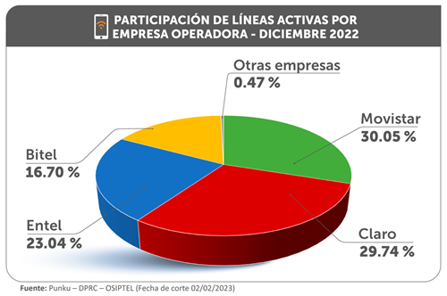 Al cierre de 2022, las empresas operadoras Entel y Claro incrementaron sus líneas móviles en 4.42 % y 1.16%, respectivamente, lo que se tradujo en una mayor participación en el mercado para dichas empresas con respecto a la registrada en el 2021, informó el Organismo Supervisor de Inversión Privada en Telecomunicaciones (OSIPTEL).