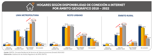 La encuesta del OSIPTEL también reveló que el progreso en el acceso a internet se ha observado tanto en las conexiones móviles como en las fijas. Para el año 2022, el 89.5 % de los hogares peruanos contaban con acceso a internet móvil; en comparación con el 85.8 % del año anterior. Asimismo, el acceso a la conexión fija se incrementó a 41.7 % en 2022, frente al 39.4 % registrado previamente.