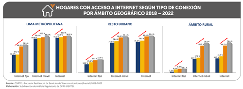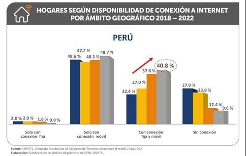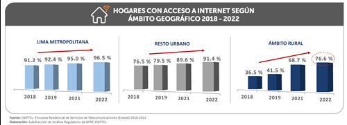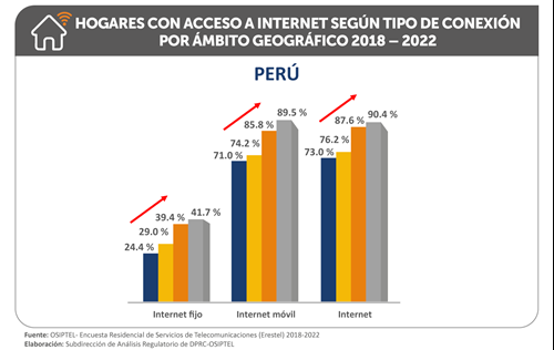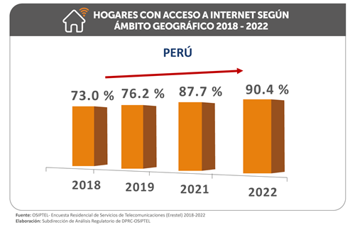 La conectividad sigue en aumento en el Perú. Al cierre del año 2022, el 90.4 % de hogares peruanos, es decir, 9 de cada 10 hogares, tenían acceso a internet, ya sea fijo o móvil, según los datos de la Encuesta Residencial de Servicios de Telecomunicaciones (Erestel), encargada por del Organismo Supervisor de Inversión Privada en Telecomunicaciones (OSIPTEL). Esta cifra representa un aumento de 2.7 puntos porcentuales en comparación a lo registrado en el 2021 (87.7 %).