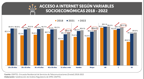 En la segmentación por variables socioeconómicas, de acuerdo a la Erestel 2022, el crecimiento más notable se observó en el sector C, al pasar de 94.5 % a 97.7 % entre 2021 y 2022. En el sector D/E, el acceso a internet fijo o móvil alcanzó el 84.6 % frente a lo registrado en el periodo previo (81.5 %). En tanto, en el sector AB el acceso de internet se mantuvo por encima del 99 %.