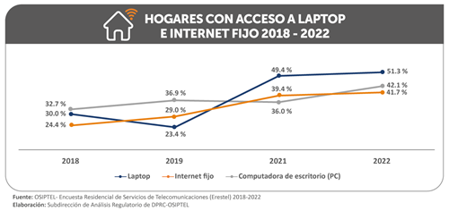 Según los resultados de la Erestel, el aumento del acceso a internet fijo coincidió con el incremento en la presencia de computadoras de escritorio en los hogares, que alcanzó el 42.1 %, una cifra superior a la registrada en 2021 (36.0 %). Asimismo, se observó un aumento de laptops en las familias peruanas, pasando del 49.4 % al 51.3 %, entre el 2021 y 2022, lo que significa que más de la mitad de hogares cuentan con este aparato.