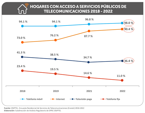 La Erestel también reveló que el 98.7 % de los hogares peruanos tienen acceso al menos a un servicio de telecomunicaciones, siendo la telefonía móvil (98.0 %) e internet (90.4 %) los que más han crecido en el país. Les sigue la televisión de paga (36.4 %), que mostró una leve recuperación con respecto al año anterior (34.7 %). En tanto, la demanda de telefonía fija sigue descendiendo, pasó de 14.6 % a 11.0 % entre 2021 y 2022.