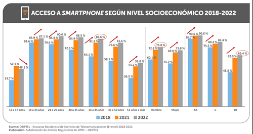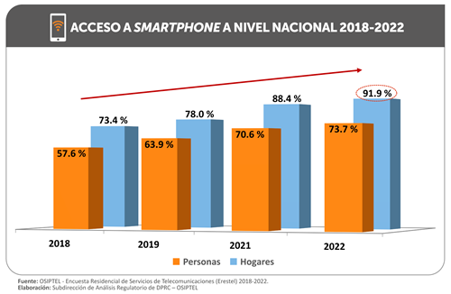 De acuerdo a la encuesta, la presencia de estos dispositivos móviles en los hogares peruanos aumentó del 88.4 % en 2021 al 91.9 % en 2022, lo que representó un incremento de 3.5 puntos porcentuales. Con este resultado, 9 373 552 hogares tienen este dispositivo.