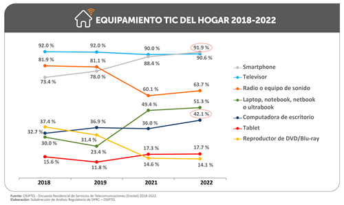 En cuanto al equipamiento de tecnologías de la información y las comunicaciones (TIC) en los hogares, el smartphone desplazó, por primera vez, al televisor como el dispositivo más común. Al 2022, la TV se encontraba presente en el 90.6 % de los hogares peruanos frente al 91.9% del dispositivo móvil.
