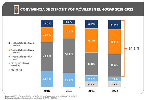Según los resultados de la encuesta al cierre de 2022, el 14.0 % de hogares tenía tres dispositivos móviles, el 36.5 % contaba con dos y el 33.6 % con uno. En tanto, el 7.0 % de hogares carecía de un dispositivo móvil.