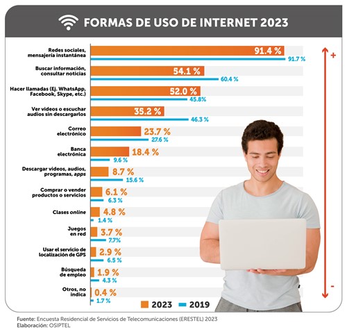 El acceso a redes sociales y aplicativos de mensajería instantánea es el principal uso que los peruanos dan al internet (sea fijo o móvil), según revela la Encuesta Residencial de Servicios de Telecomunicaciones (ERESTEL), correspondiente al año 2023, del Organismo Supervisor de Inversión Privada en Telecomunicaciones (OSIPTEL).