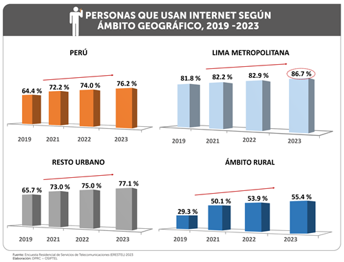 Al cierre de 2023, el 76.2 % de los peruanos de doce años a más (21 295 255) señaló haber hecho uso de internet, lo que representó un salto de más de 11.8 puntos porcentuales frente a las cifras registradas en 2019 (64.4 %).