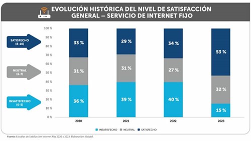 En tanto, el nivel de insatisfacción con el servicio de internet fijo mostró una reducción de 25 puntos porcentuales entre el 2022 y 2023, alcanzando así solo un 15 % de los usuarios encuestados.