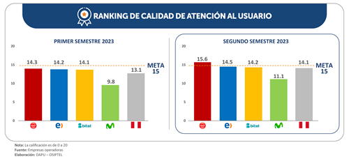 La evaluación colocó a Claro en el primer lugar del ranking con una calificación de 15.6 puntos, evidenciando un avance de 1.3 puntos respecto a la evaluación del primer semestre de 2023. De esta manera, fue la única empresa operadora en superar la meta inicial esperada de 15 puntos.